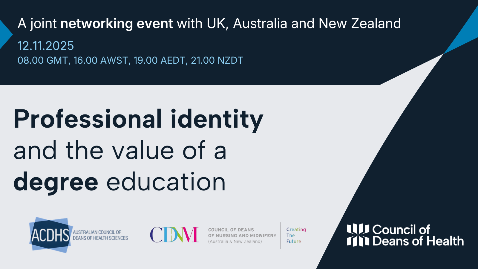 Join us for an online interactive event co-hosted by the Council of Deans of Health (UK), the Council of Deans of Nursing and Midwifery Australia and New Zealand, and the Australian Council of Deans of Health Sciences.